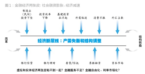 我们试图建立如下的风险监测框架(图1):图1的上方是实体经济的各个驱动因素,图上看,相关驱动力因素拉动经济下行的势头明显。下方则代表了社会融资膨胀的力量,相关因素有信贷、信托和委托贷款、票据融资、企业债券发行等。中间表示的是中国经济断层线所面临的承压。图1的示例集中反映了融资和实体经济的相互作用。但通过稍微的变化,我们也可以在图1两侧的“改革”和“结构转换”的标记内注入政策变量,从而可以适用于分析去杠杆、去产能及结构改革对断层线的考验。因此,对于观察中国经济未来风险,这是一个很有用的方法框架。