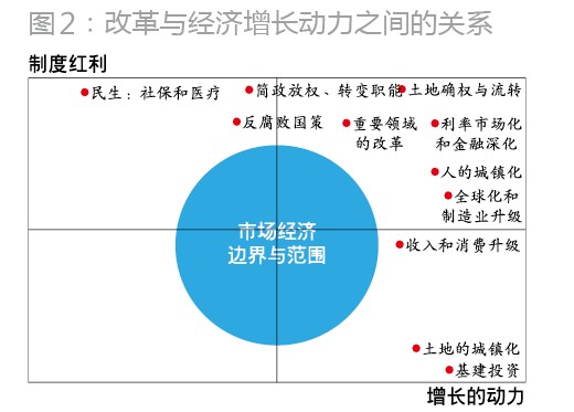 其次,我们依据驱动力分析方法,对改革红利与经济增长的动力这两个变量进行了分析。驱动力因素分析把关注重点放在一个二维的图中显示(图2)。我们发现,处于东北象限内的内容很要紧,如简政放权、政府职能转变、金融改革、土地改革、全球化和制造业升级、城镇化,这些因素均为制度红利大、增进经济增长动力显著的事项,也是党的十八届三中全会将要推进的改革事项。把东北象限的改革扎实地推进了,实体经济与金融的皮就会贴得越紧,金融的效率也就越高。