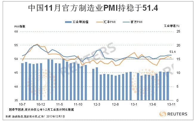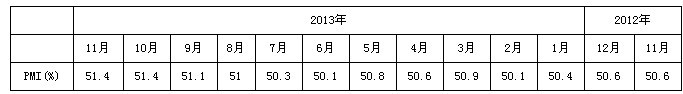 中国宏观经济先行指标--11月官方制造业PMI较上月持平并高于市场预期,该指数自7月以来连续四个月小幅上升后转为平稳,显示经济运行进入平稳增长区间。 中国国家统计局和物流与采购联合会(CFLP)周日联合公布,11月制造业采购经理人指数(PMI)CNPMIB=ECI为51.4,同上月持平。该数据高于路透访问分析师预估中值51.1。 “11月份PMI指数与上月持平,预示未来经济增长总体平稳。”中国物流与采购联合会特约分析师张立群评论称。 但他同时指出,生产经营活动预期指数明显回落,反映企业对未来市场前景比较谨慎。综合企业预期、投资、消费、出口等市场需求方面的情况,经济平稳增长态势已初步确立。 下表为各月官方制造业采购经理指数(PMI):