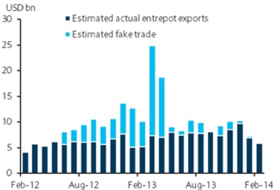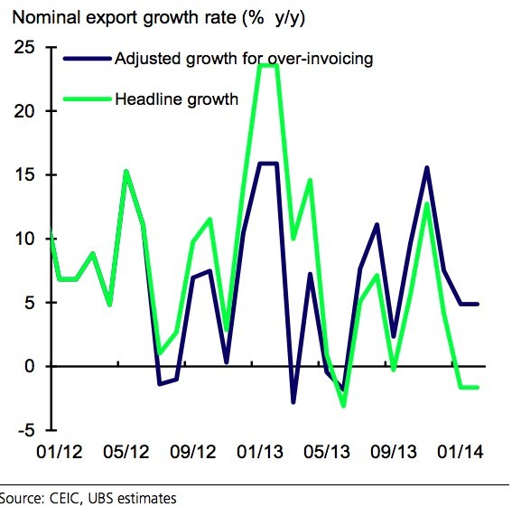 下图为巴克莱对于真实与虚假出口数据的图表: