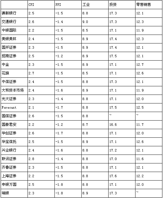 以下为各机构预测详情:(同比%,其中投资数据为1-5月)