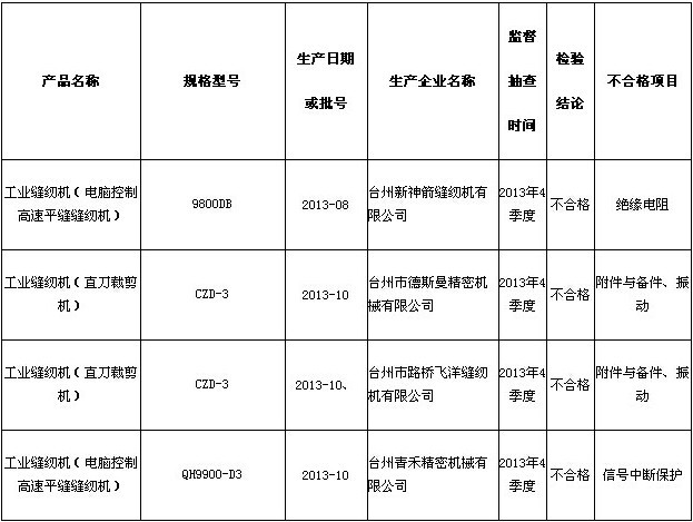 近期,根据《中华人民共和国产品质量法》、《浙江省产品质量监督条例》的规定,浙江省质量技术监督局组织开展了全省工业缝纫机产品监督抽查,抽查了台州、宁波、杭州、温州等4个地区52家企业的52批次工业缝纫机产品。经检验,不合格4批次,生产企业涉及台州新神箭缝纫机有限公司、台州市德斯曼精密机械有限公司、台州市路桥飞洋缝纫机有限公司、台州青禾精密机械有限公司。