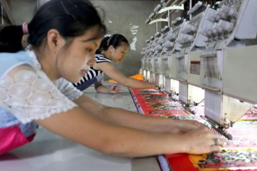 2014年7月7日,在榕江县一个刺绣加工厂,10余名工人正在电脑绣花机前穿线、剪线头、包装产品,厂内一派繁忙。加工厂负责人刘正志一边包装产品,一边兴奋的表示,带有榕江元素的刺绣产品好卖比较好卖,现在生产的背带和背包被贵阳一家公司预订,本月还有其它订单没开始做。