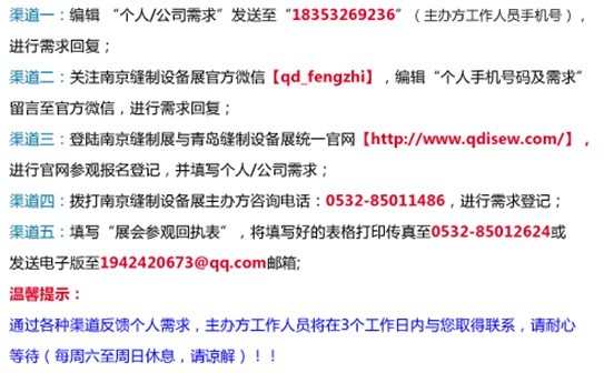 展会主办方还表示,为了让专业观众的需求在展会现场得到满足,“南京缝制设备展会观众需求收集活动”将持续进行,专业观众可以通过QQ、微信、电话、电邮等多种渠道进行需求回复,同时将在众多回复观众中抽取优秀观众参与组织展会奖100名(将在11月27日展会举办前分批公布获奖名单)。参与回复渠道(如下图)