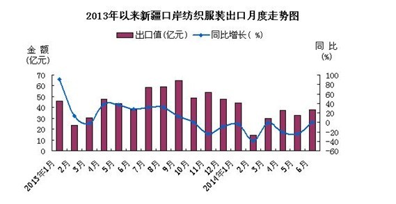 (一)6月份同比、环比双双增长。自1月份达到年内最高值后,新疆口岸纺织服装出口震荡起伏,6月份,新疆出口纺织服装37.9亿元,同比增长0.1%,环比增长15.2%。