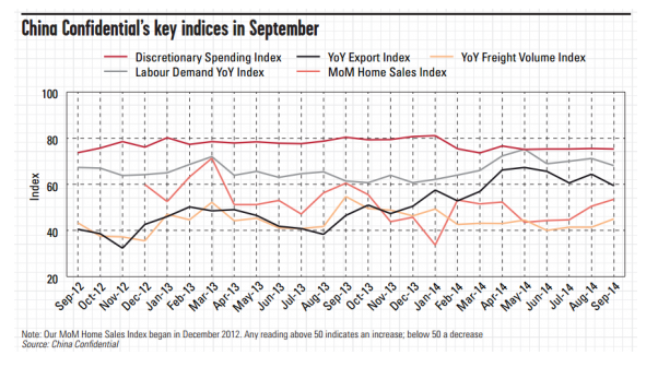 在这些经济学家发布预测之前,已有多个迹象显示9月份增长低迷。《中国投资参考》编制的可支配支出指数、企业用工需求、出口增长和货运量等一系列指标在当月不是下降,就是保持低迷(见下图)。