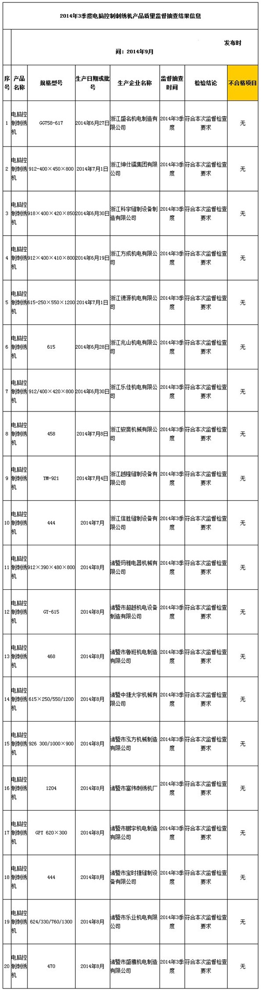 绍兴市质监局公布第三季度电脑绣花机监督抽查结果