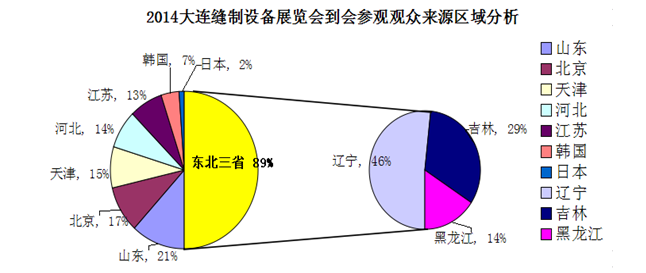 2014大连国际缝制设备展览会观众到会参观为6937人/次,其中东北三省(辽宁、吉林、黑龙江)占比达89%,其他地区观众占比11%。据统计2014大连国际缝制设备展总成交量(现场成交量+潜在成交量)超过1700万元,2015年预计增加43%以上。