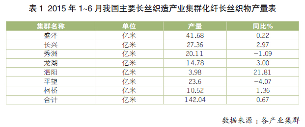 另据各产业集群统计,2015年1~6月,盛泽、长兴、秀洲、龙湖、泗阳、平望、柯桥七地合计化纤长丝织造规模以上企业主营业务收入同比增加2.32%,增幅较一季度缩小1.93个百分点。