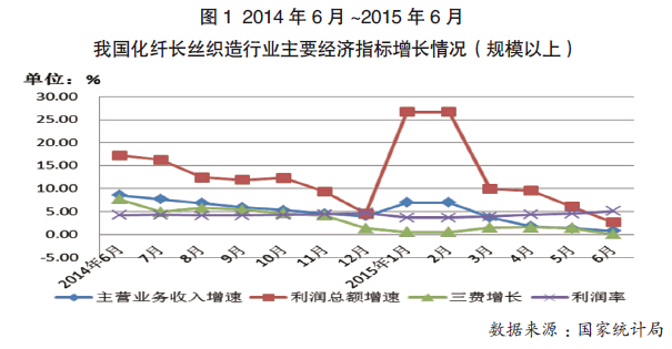 据国家统计局统计,2015年1~6月我国规模以上化纤织造及印染精加工企业主营业务收入累计为523.58亿元,同比增长0.8%,增速比去年同期减少了7.72个百分点;利润总额累计为23.94亿元,同比增长2.62%,增速比去年同期减少了14.6个百分点;营业利润同比下降3.54%,表明织造主业实际盈利情况不佳。