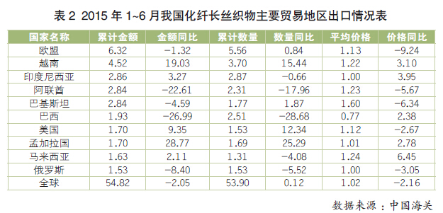 2015年1~6月,受国际市场需求不足影响,我国纺织织物出口增速出现负增长。据海关统计,2015年1~6月,我国纺织织物累计出口175.31亿美元,同比增长0.15%。其中化纤长丝织物累计出口54.83亿美元,同比下降2.05%。尽管一季度受春节假期影响,我国化纤长丝织物出口情况出现小幅上涨,但进入二季度后仍难以抵制国际市场低迷的压力,出现了负增长。