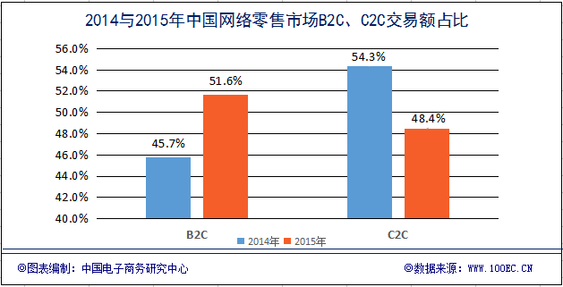 报告显示,2015年国内B2C市场交易规模占51.6%,较2014年的45.7%,增加了5.9%;C2C市场交易规模占48.4%,较2014年54.3%,减少了5.9%。