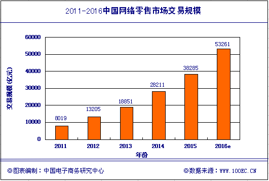 据中国电子商务研究中心(100EC.CN)监测数据显示,2015年中国网络零售市场交易规模达38285亿元,相比2014年的28211亿元,同比增长35.7%。
