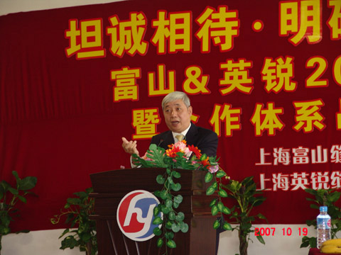 2007年10月18日,以“坦诚相待,规则明确,共促发展”为主题的富山&英锐2007协作伙伴会议暨合作体系战略联盟启动会在富山&英锐(上海)生产基地内隆重举行,中国缝制机械协会副理事长胡淼海,中国缝制机械协会副理事长兼零部件专业委员会主任陈启鸿,以及富山国内外供应商在内的一百多位嘉宾参加了本次会议。