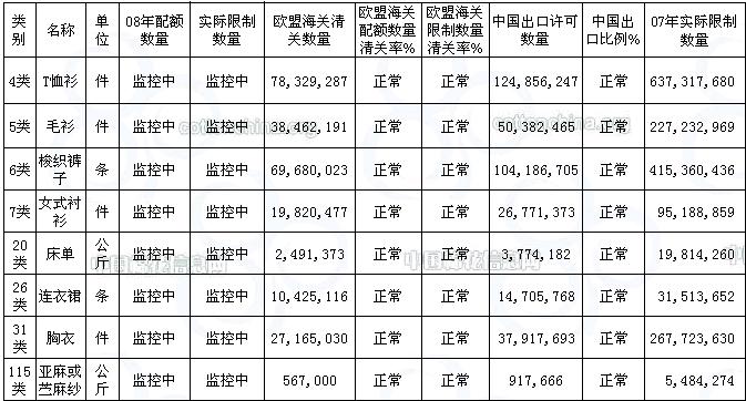 2008年1月1日起中国出口欧盟纺织品服装实行双向监控,截至2008年12月31日,有效期一年。在此期间,对T恤衫,毛衫,梭织裤子,女士衬衫,床单,连衣裙,胸衣,麻纱共8类产品实施监控,相比2006,2007年,不再对梭织棉布和桌布实行数量监管。