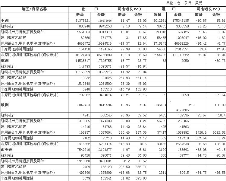 2007年1~12月份我国缝纫机零部件进出口分地区情况